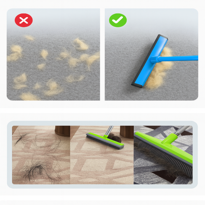 La escoba de silicona elimina polvo, pelos y líquidos sin esfuerzo, incluso en superficies difíciles.